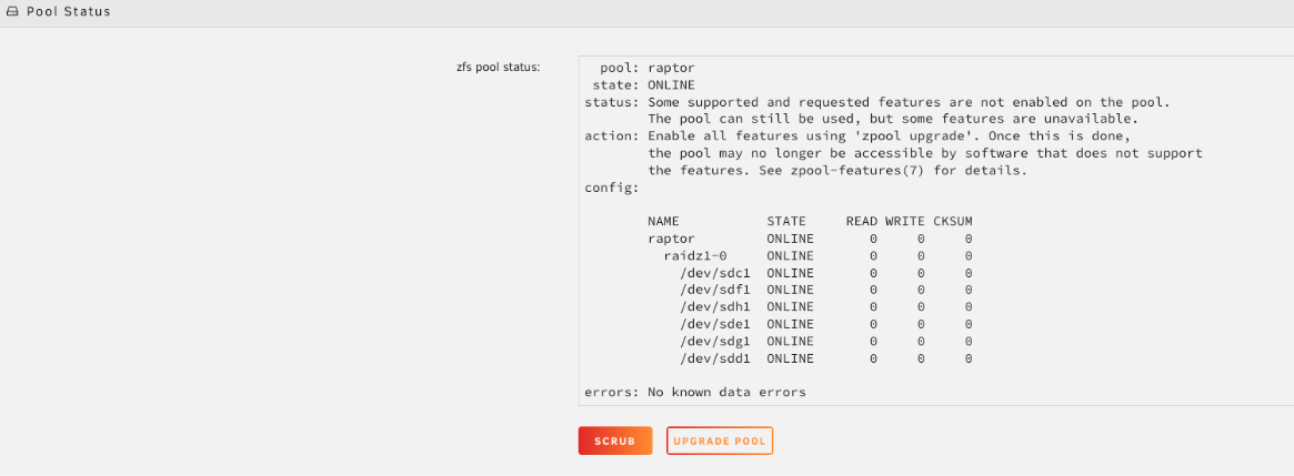 raptor)以打开其配置。 - 在 池状态 下,检查状态并点击 Scrub。